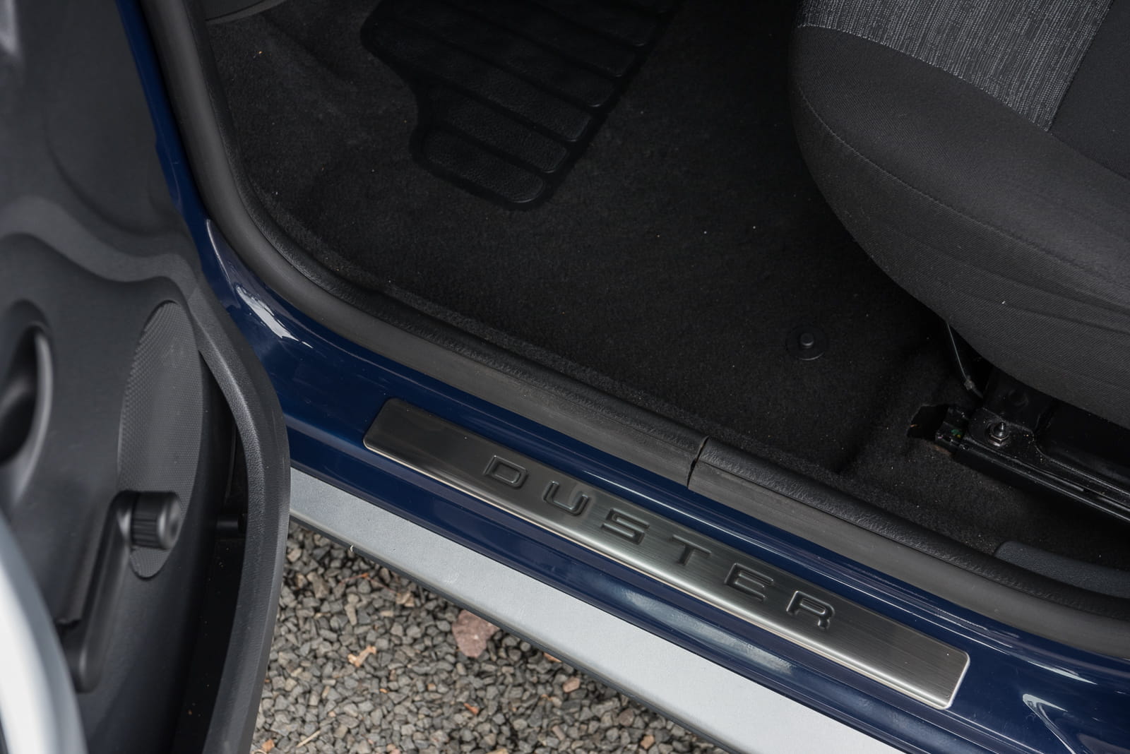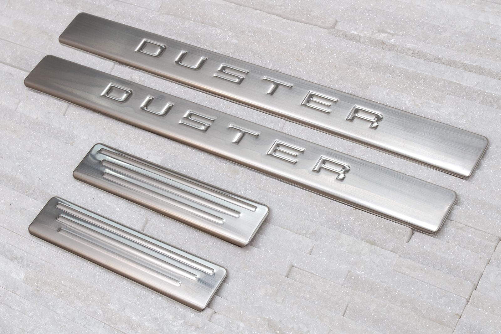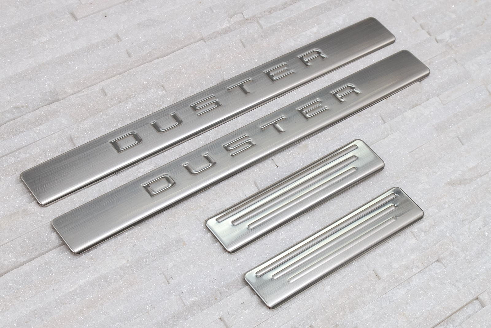 Listwy montowane są na lakierowane części progów wewnętrznych. Uzupełniają linię wewnętrzną drzwi, nadają okolicy progów sportowy i elegancki wygląd. Model ten przykuwa uwagę ozdobnym napisem DUSTER oraz podłużnymi liniami, wytłoczonymi na listwach. Oprócz walorów stylizacyjnych, listwy odgrywają rolę ochronną, zabezpieczając progi przed zarysowaniem i uszkodzeniami, jakie mogą powstać przy wsiadaniu oraz wysiadaniu z auta. Produkt wykonany z wysokiej jakości szczotkowanej stali nierdzewnej.