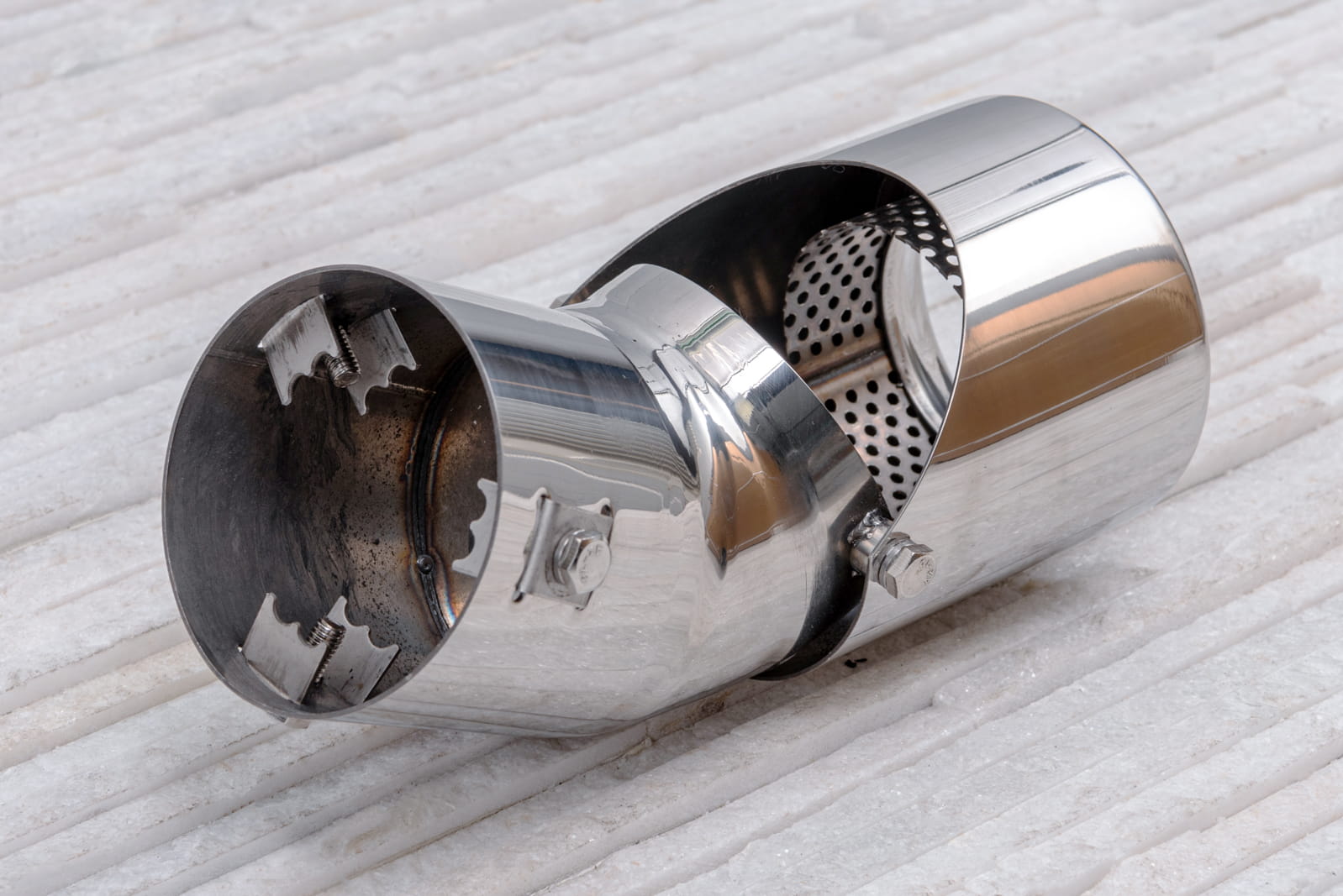 Montaż odbywa się poprzez nałożenie elementu na oryginalną rurę wydechu oraz dokręcenie znajdujących się w zestawie śrub, mocujących końcówkę na stałe. Zalecamy montaż profesjonalny.