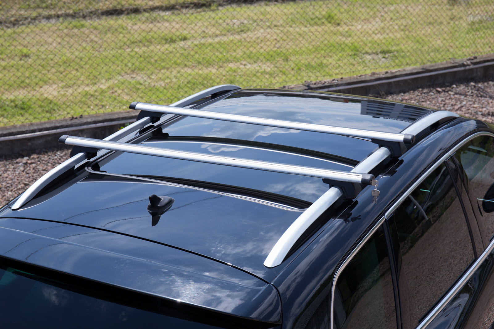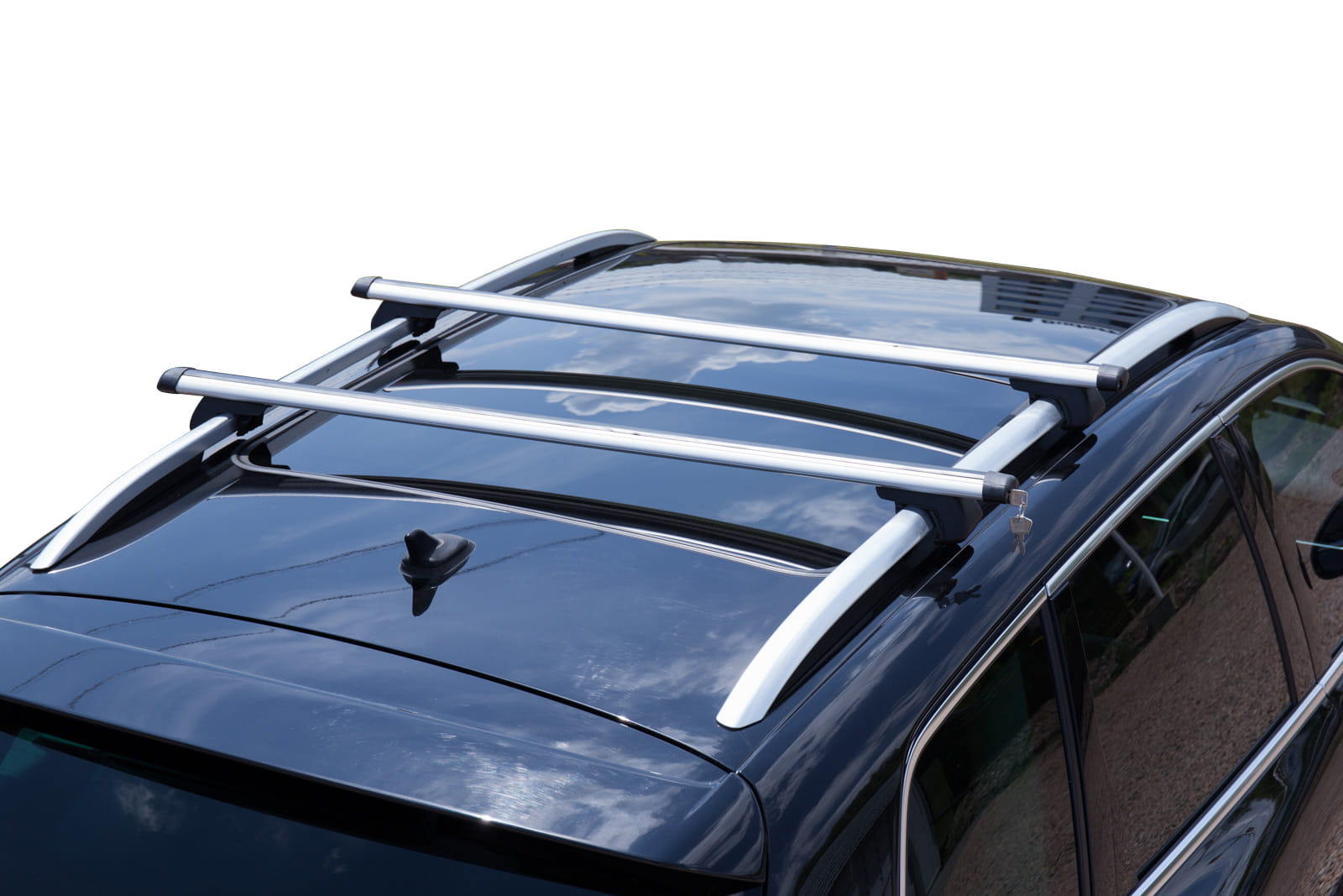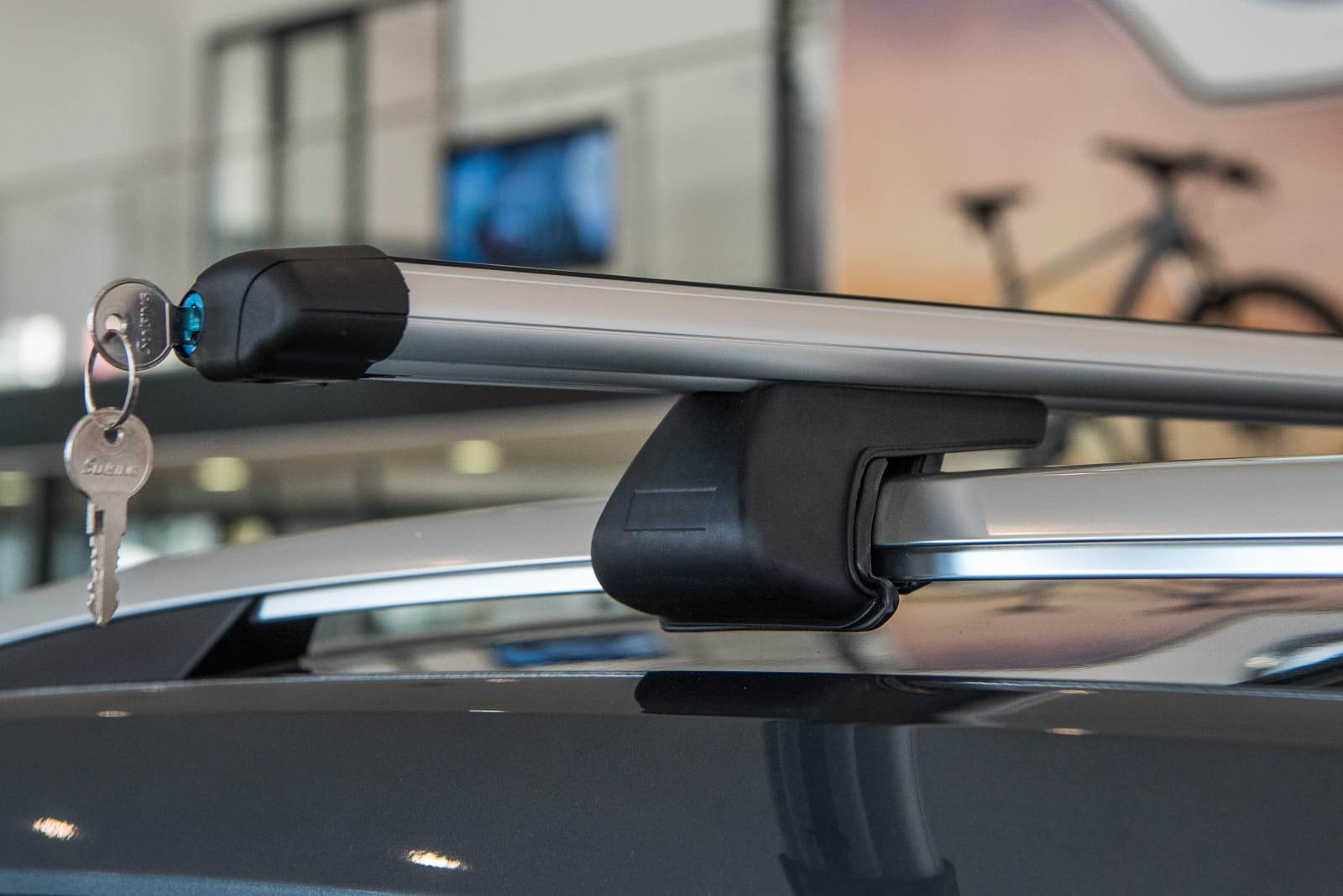 W komplecie znajdują się: dwie belki aluminiowe i cztery zaciski i system zabezpieczenia z kluczykami.