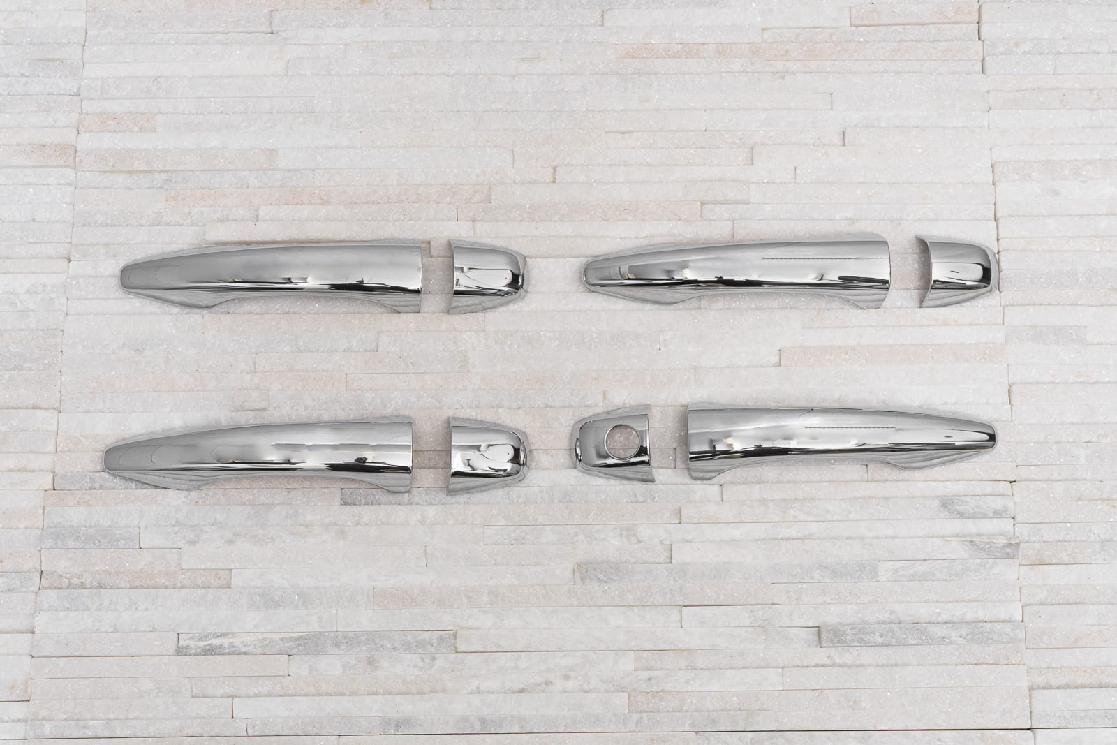 Dekoracyjne, chromowane nakładki na klamki to dodatek, który uzupełnia stylizację samochodu nutą sportowej elegancji. Idealnie dopasowane do linii samochodu, odmieniają wizerunek klamek, czyniąc z nich prawdziwą ozdobę samochodu. Produkt wykonany z wysokiej jakości chromowanego tworzywa ABS.