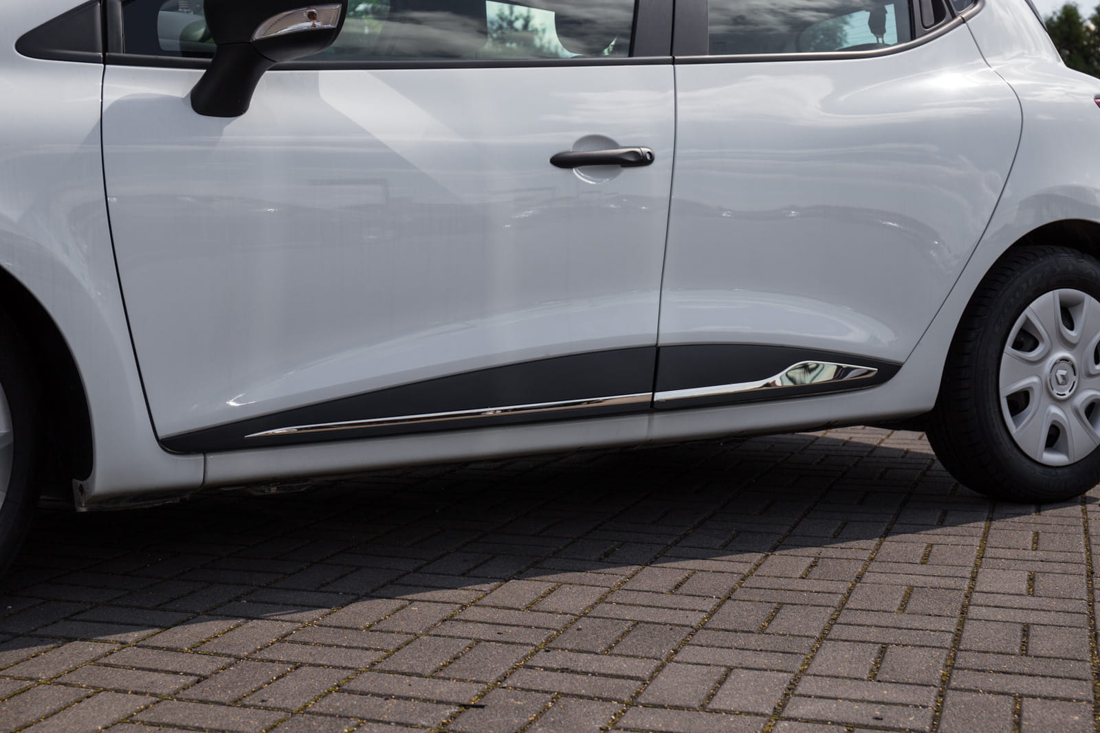 Ozdobne stalowe listwy drzwi zaprojektowane dla modelu RENAULT CLIO IV 2012-2019 (wersja Hatchback 4-drzwiowa).