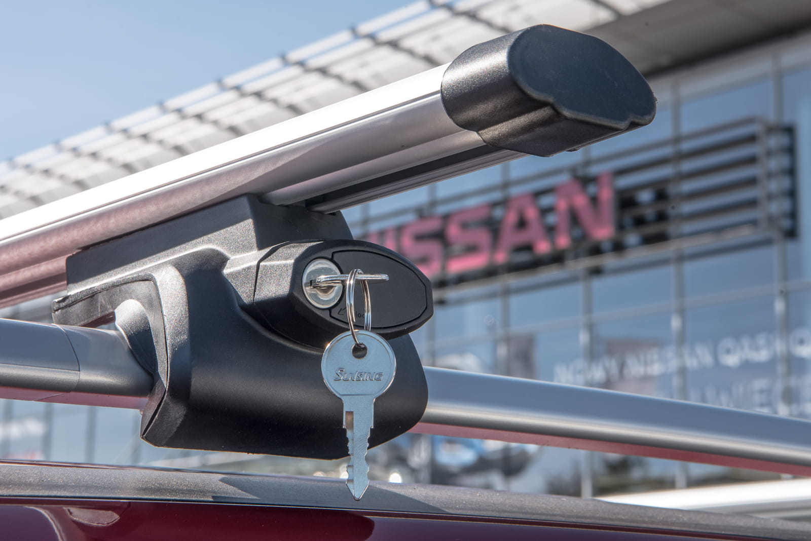 W komplecie znajdują się: dwie belki aluminiowe i cztery zaciski i system zabezpieczenia z kluczykami.