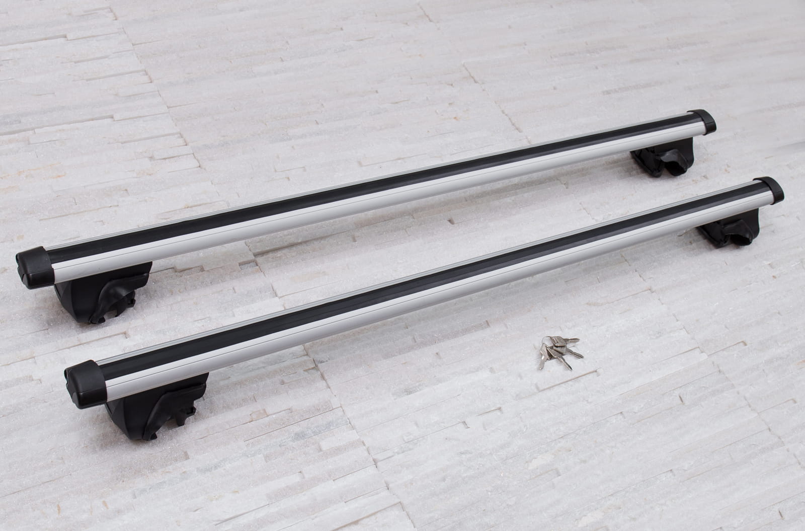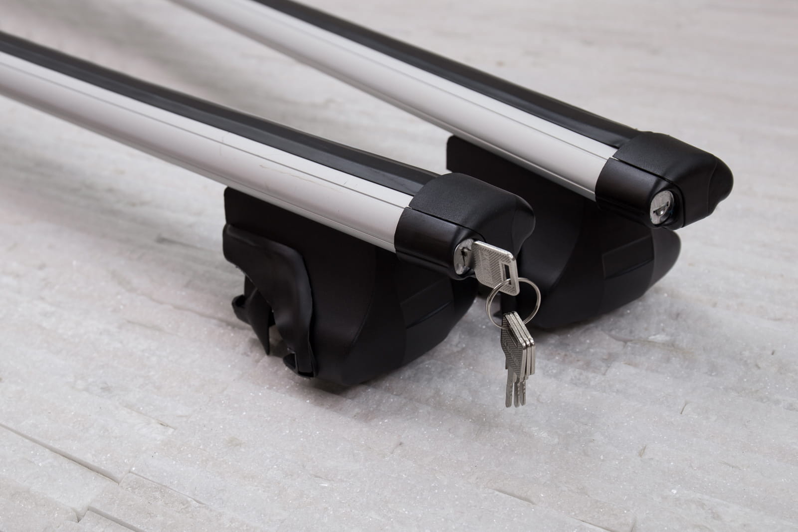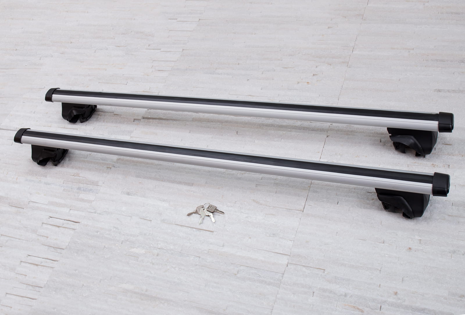W komplecie znajdują się: dwie belki aluminiowe i cztery zaciski i system zabezpieczenia z kluczykami.