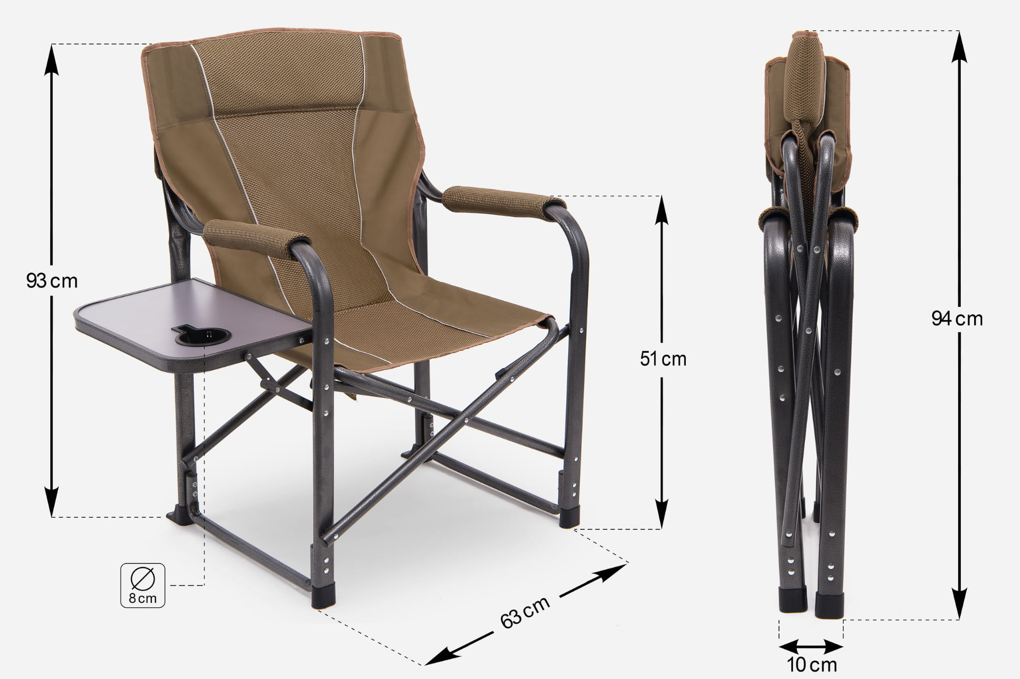 Składane, komfortowe krzesło turystyczne ze stolikiem na napoje w kolorze brązowym.