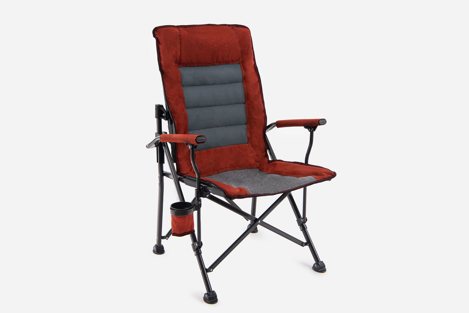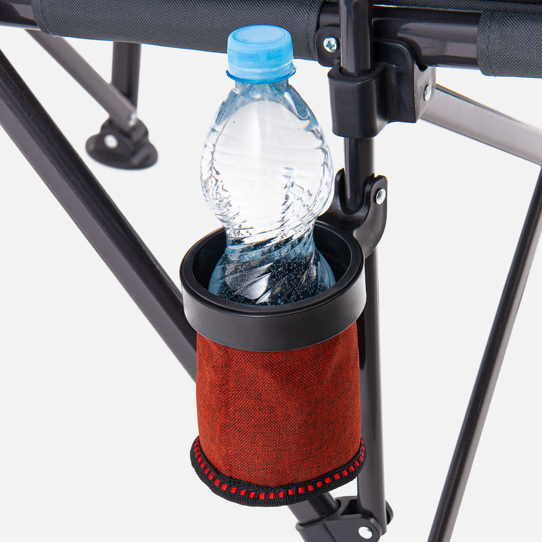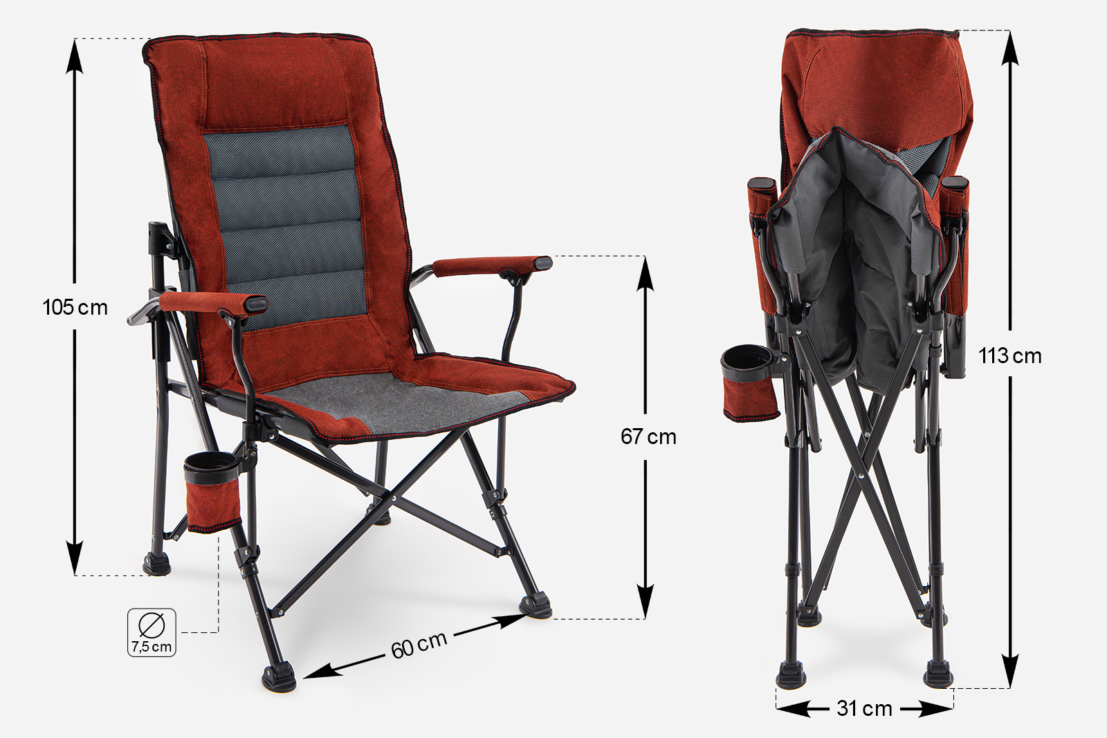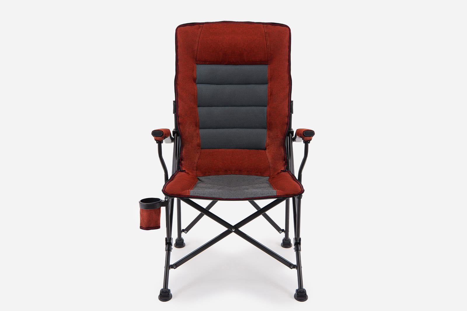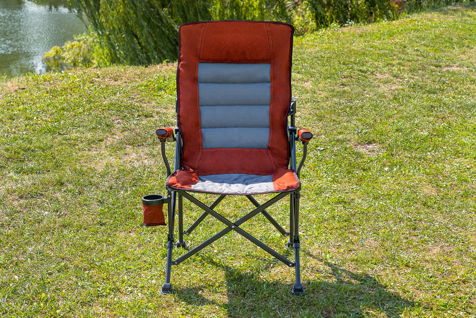 Składany, komfortowy fotel turystyczny z regulowanym, wentylowanym oparciem i uchwytem na butelkę.