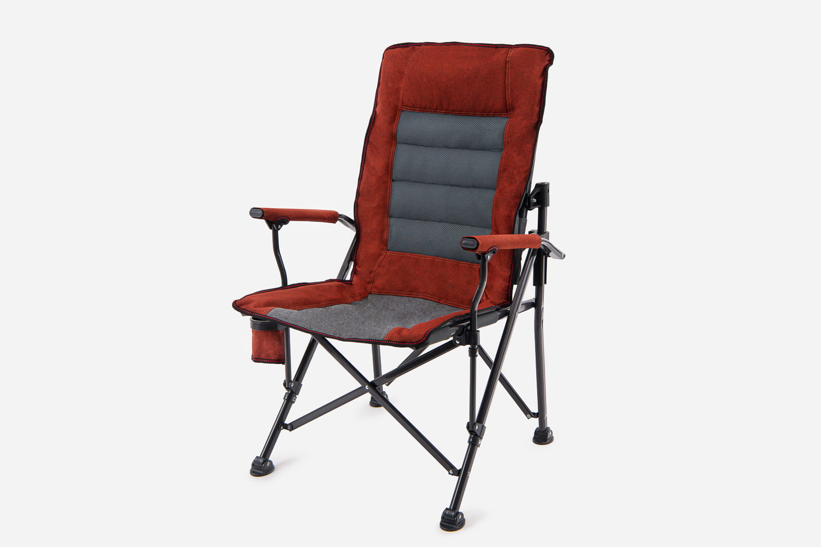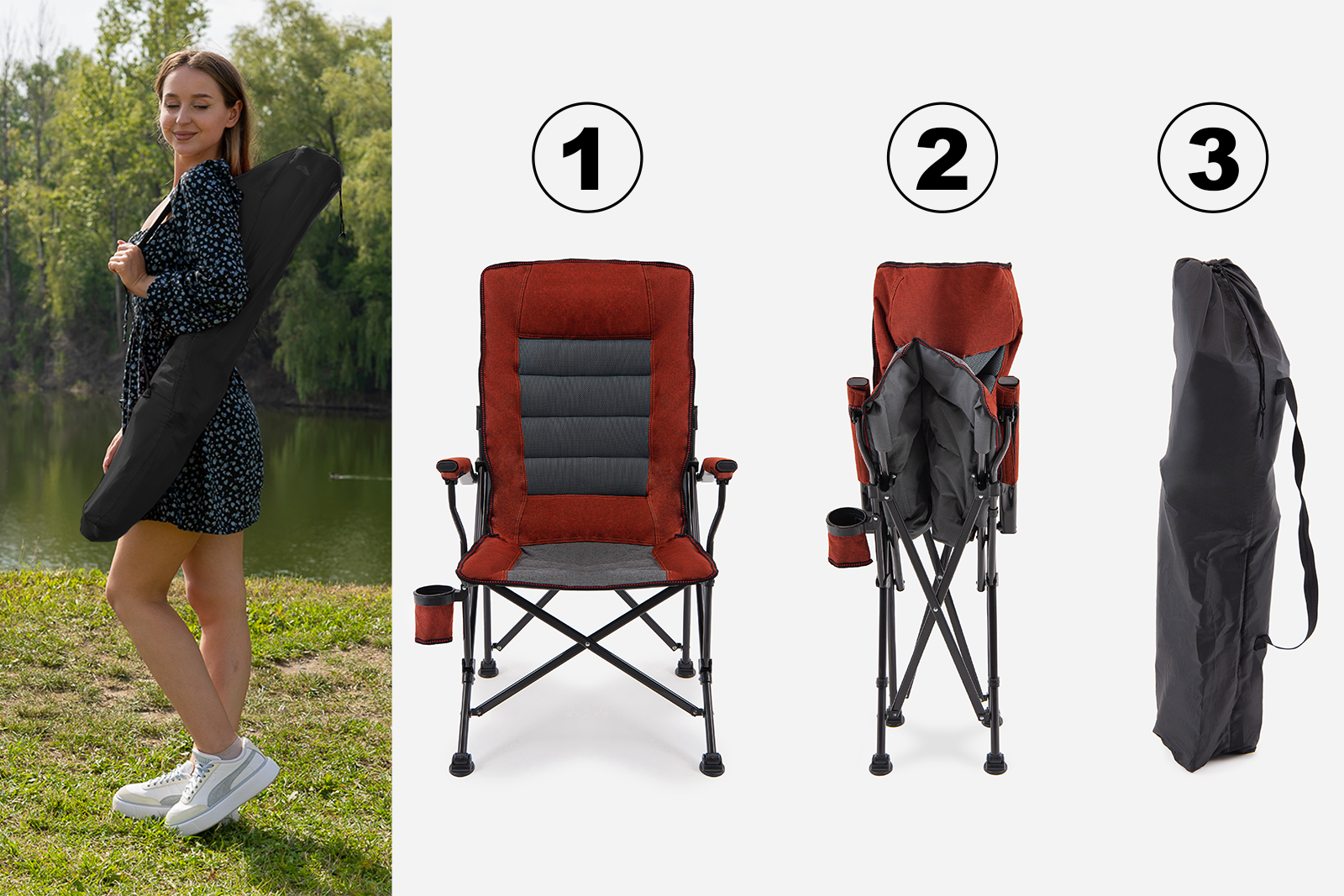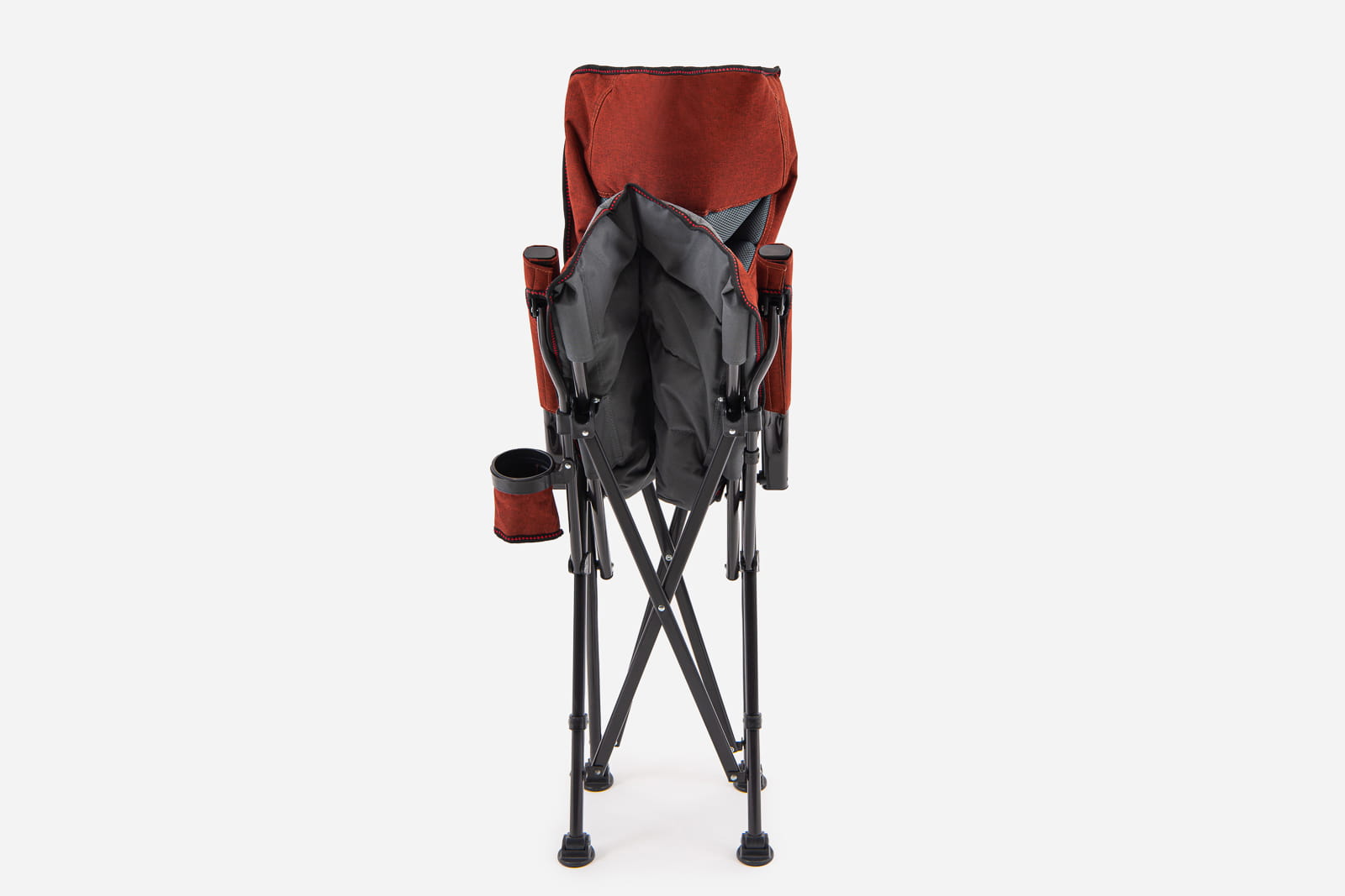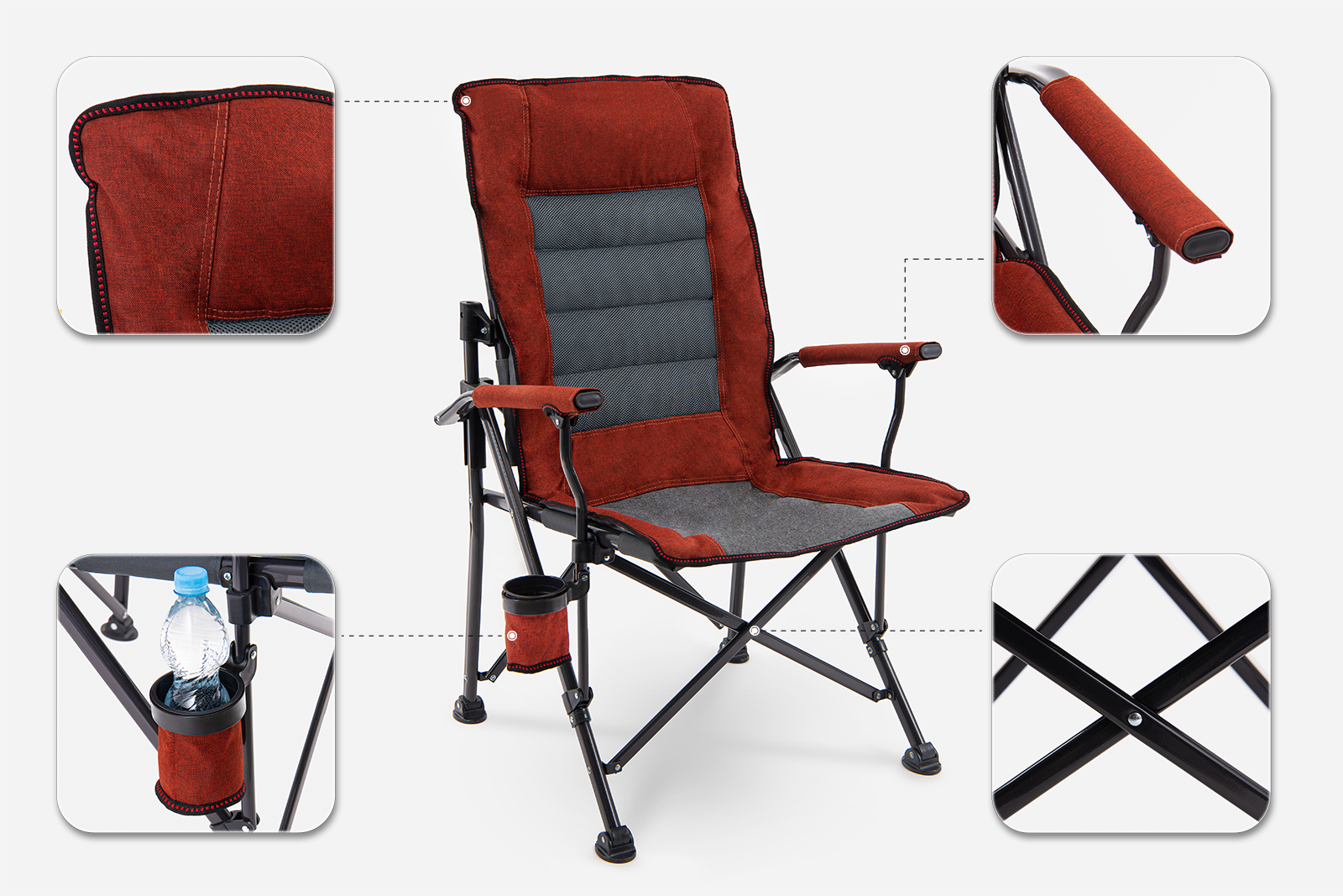 Składany, komfortowy fotel turystyczny z regulowanym, wentylowanym oparciem i uchwytem na butelkę.