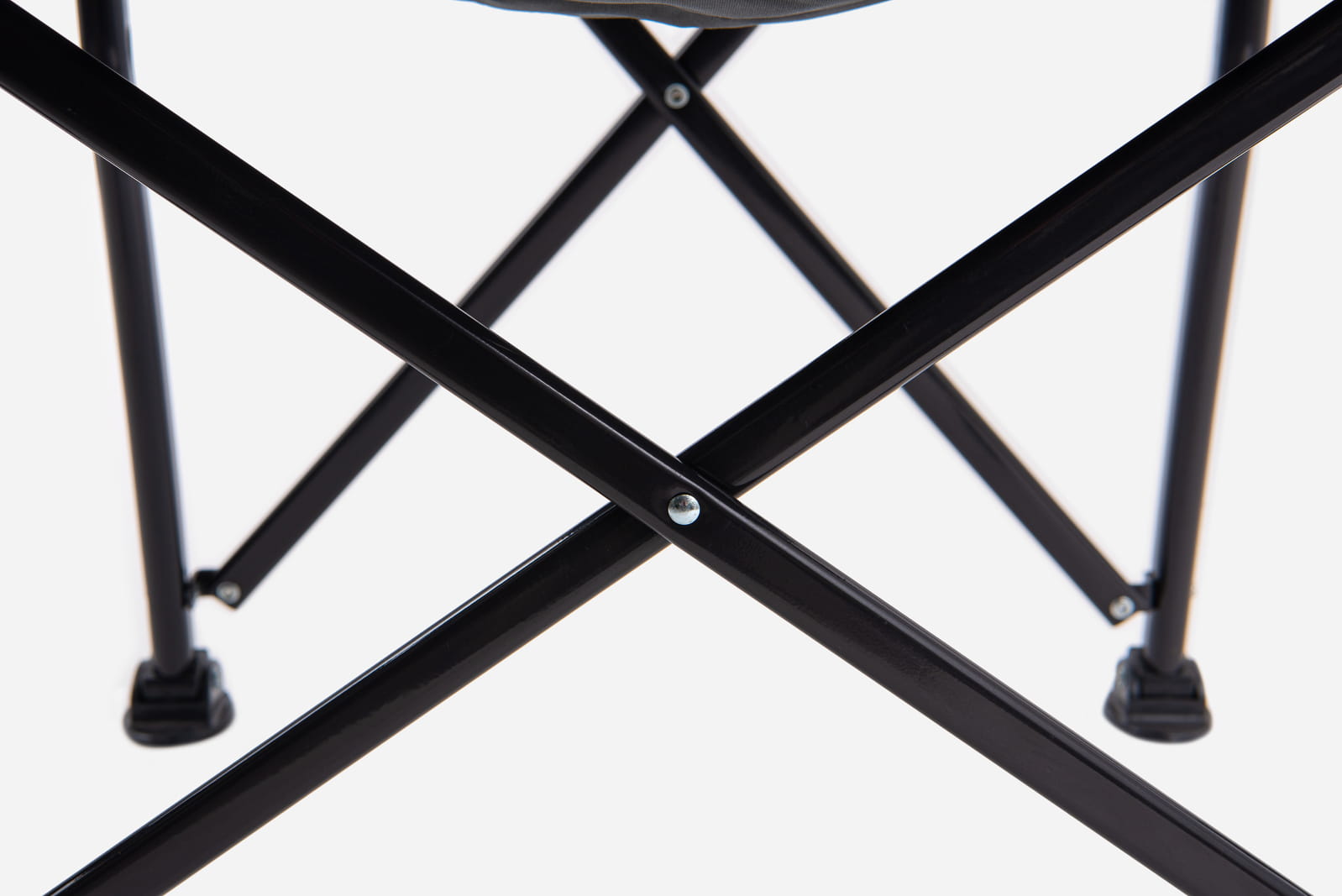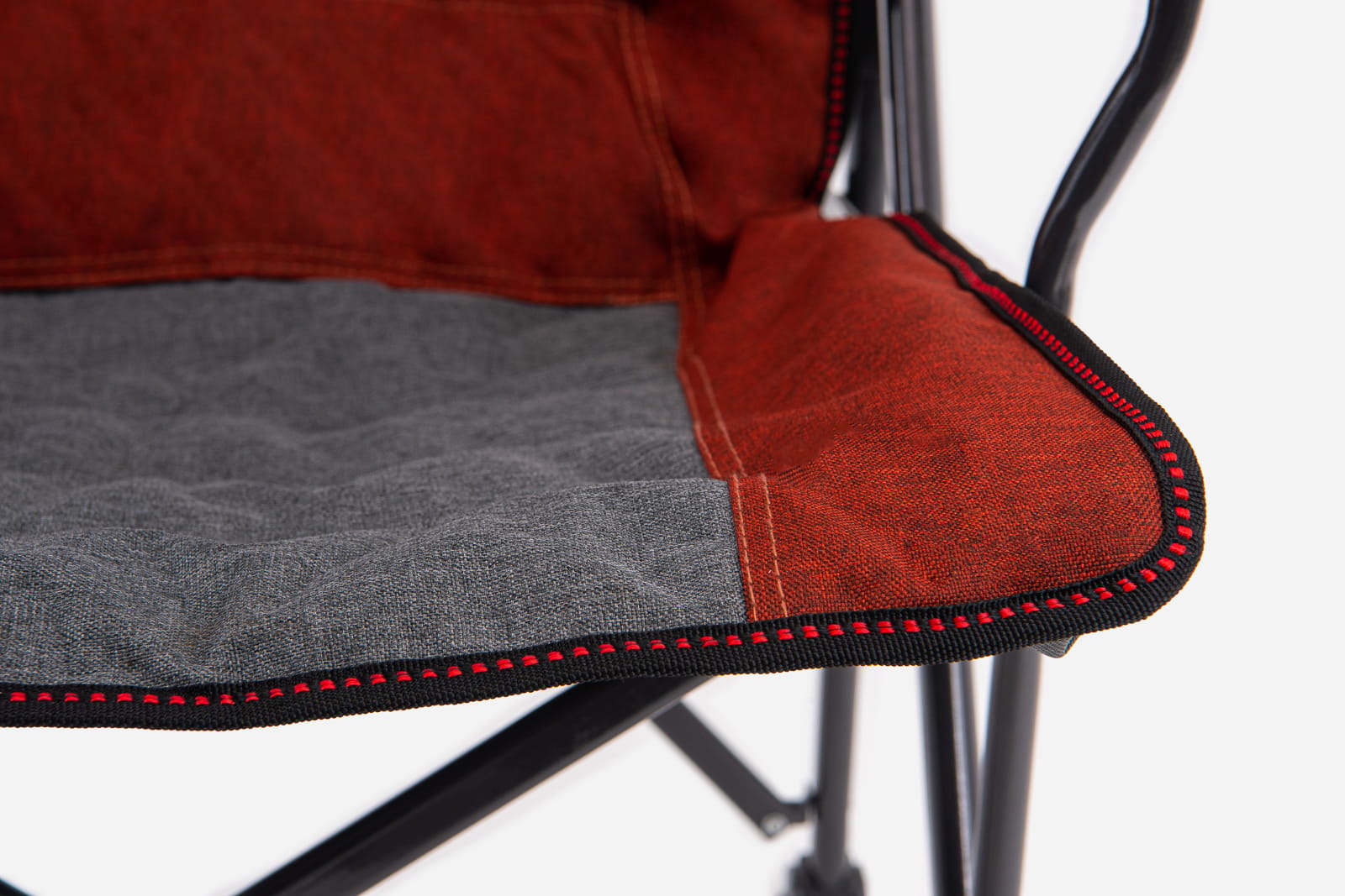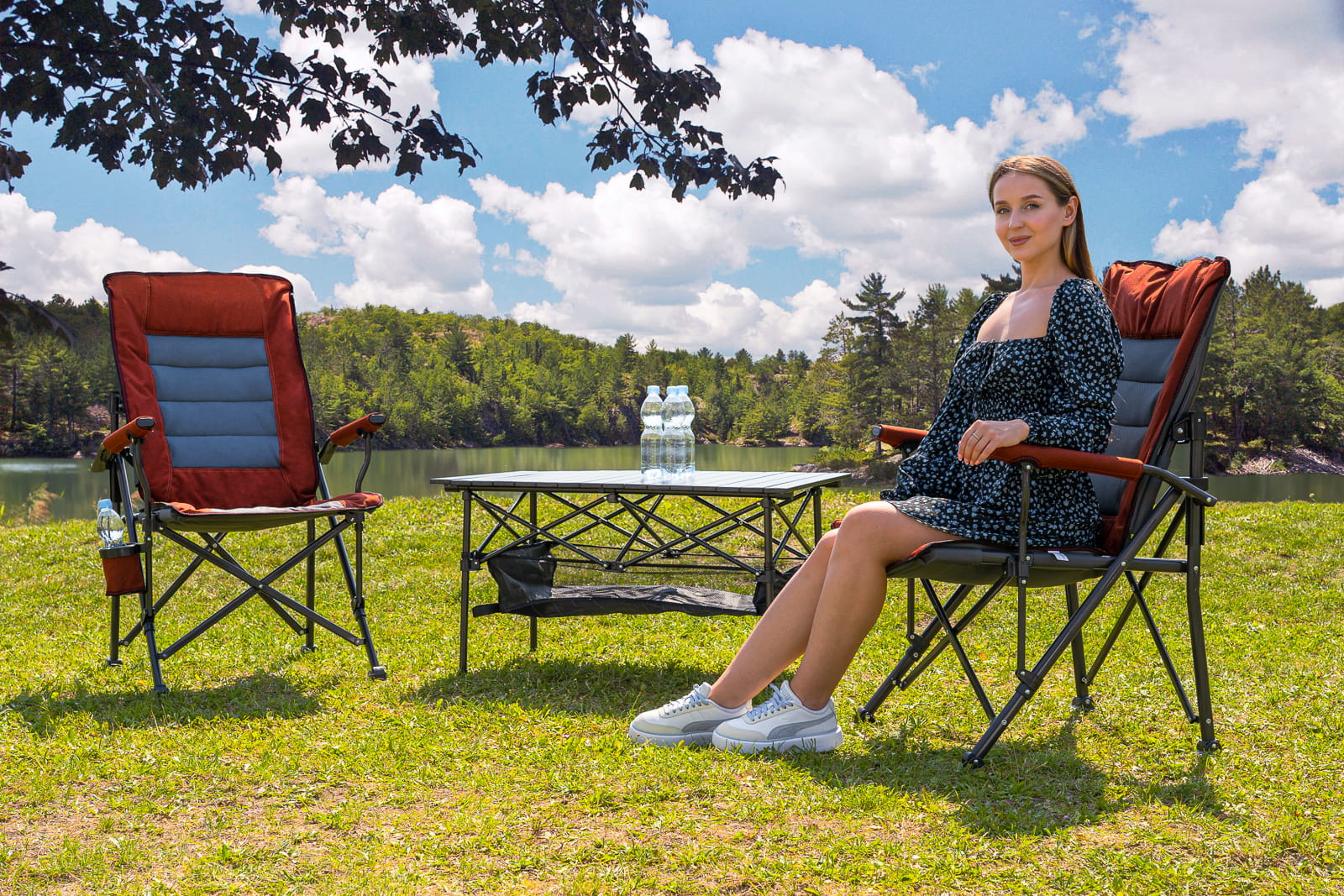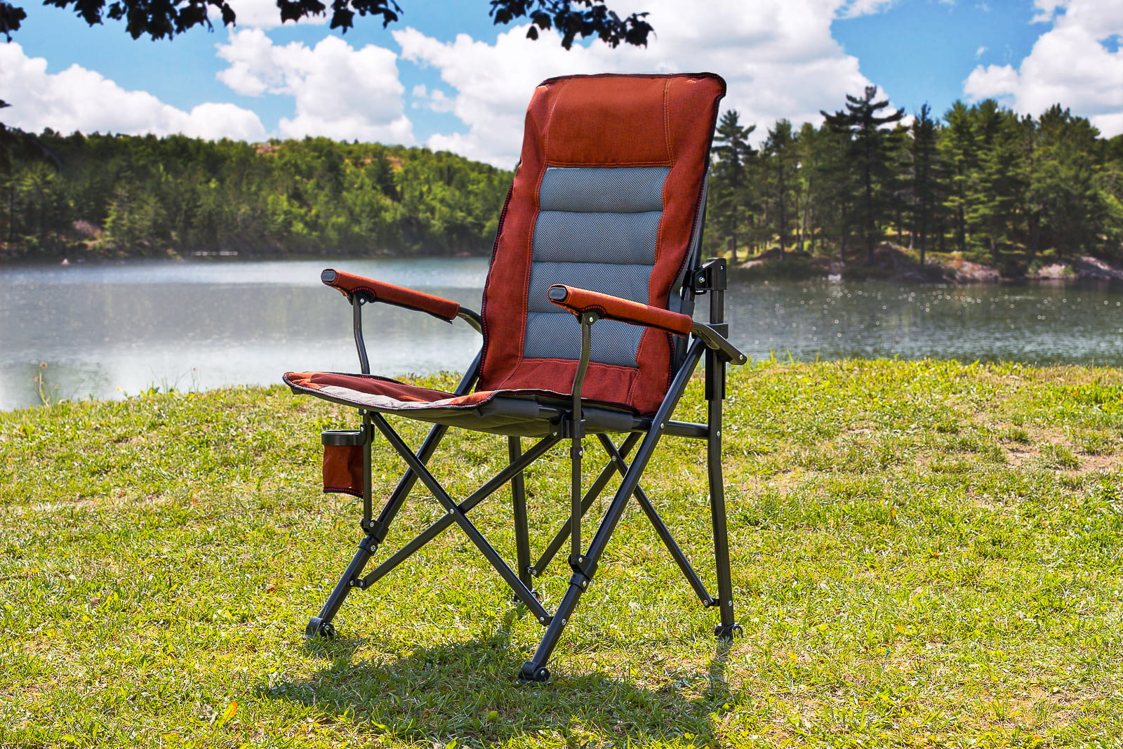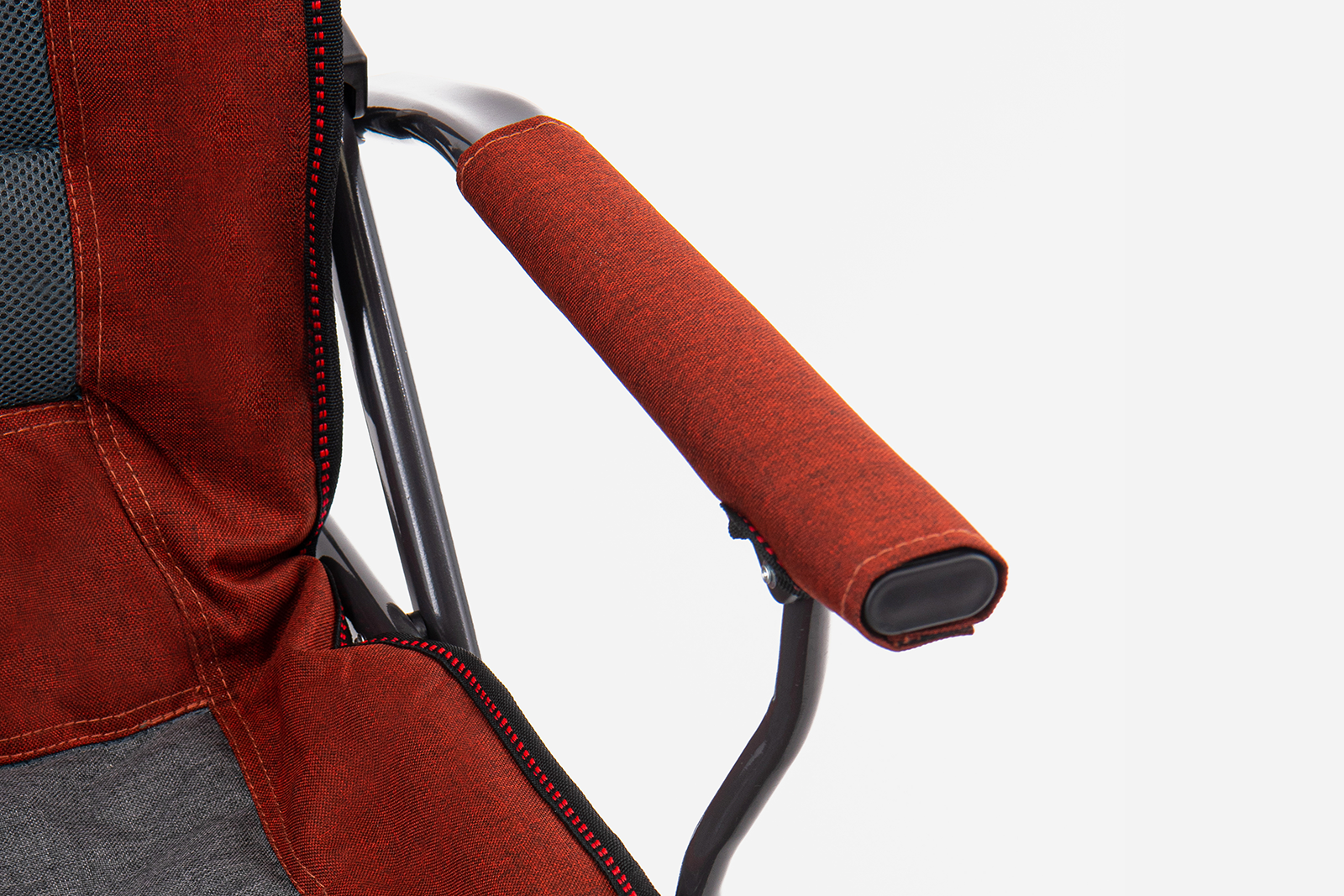 Składany, komfortowy fotel turystyczny z regulowanym, wentylowanym oparciem i uchwytem na butelkę.