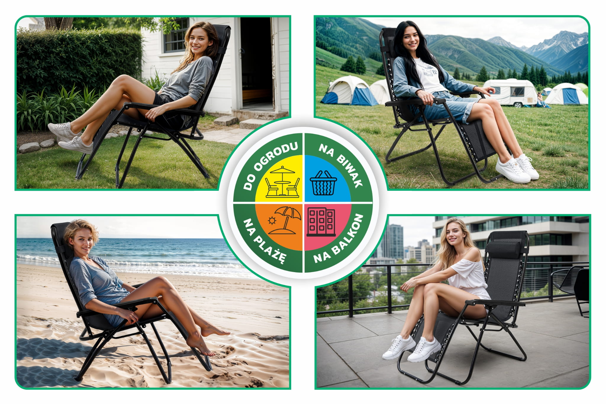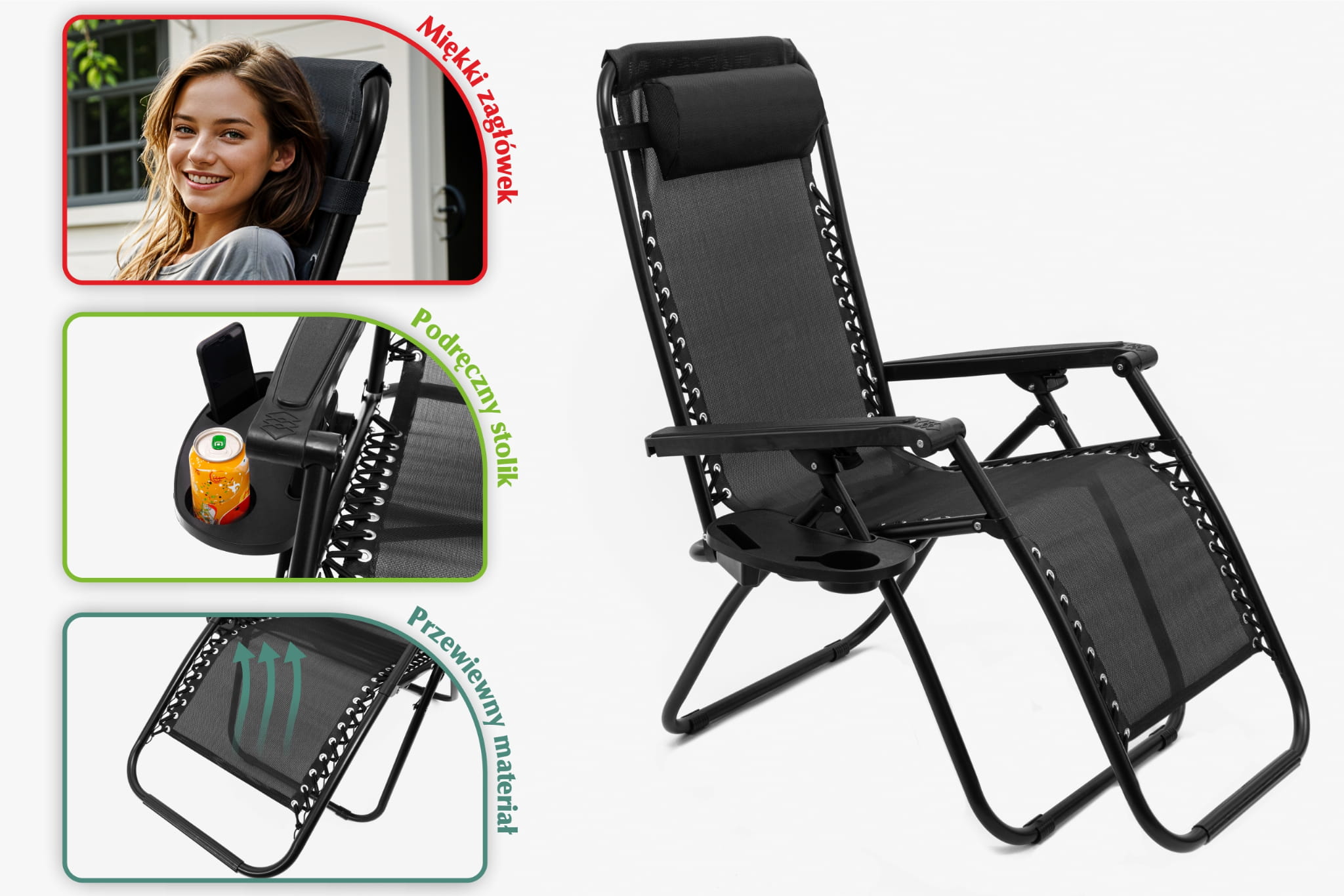 SKŁADANY LEŻAK Z PODNÓŻKIEM, ZAGŁÓWKIEM I STOLIKIEM NA NAPOJE CZARNY