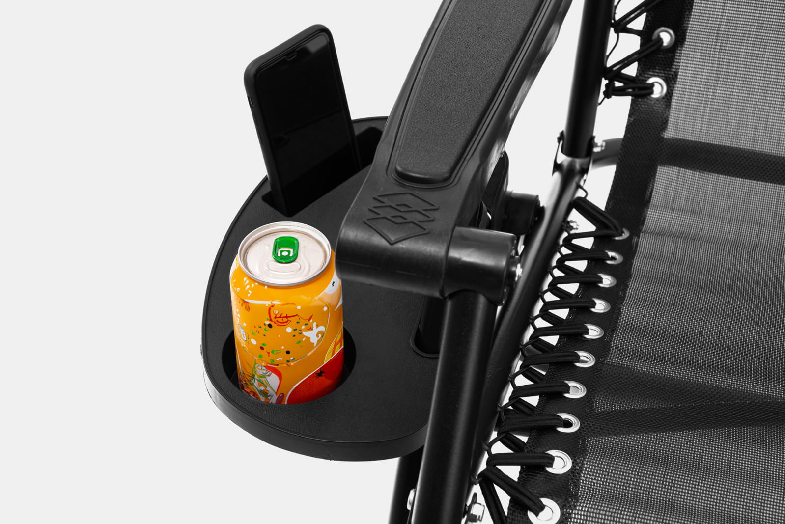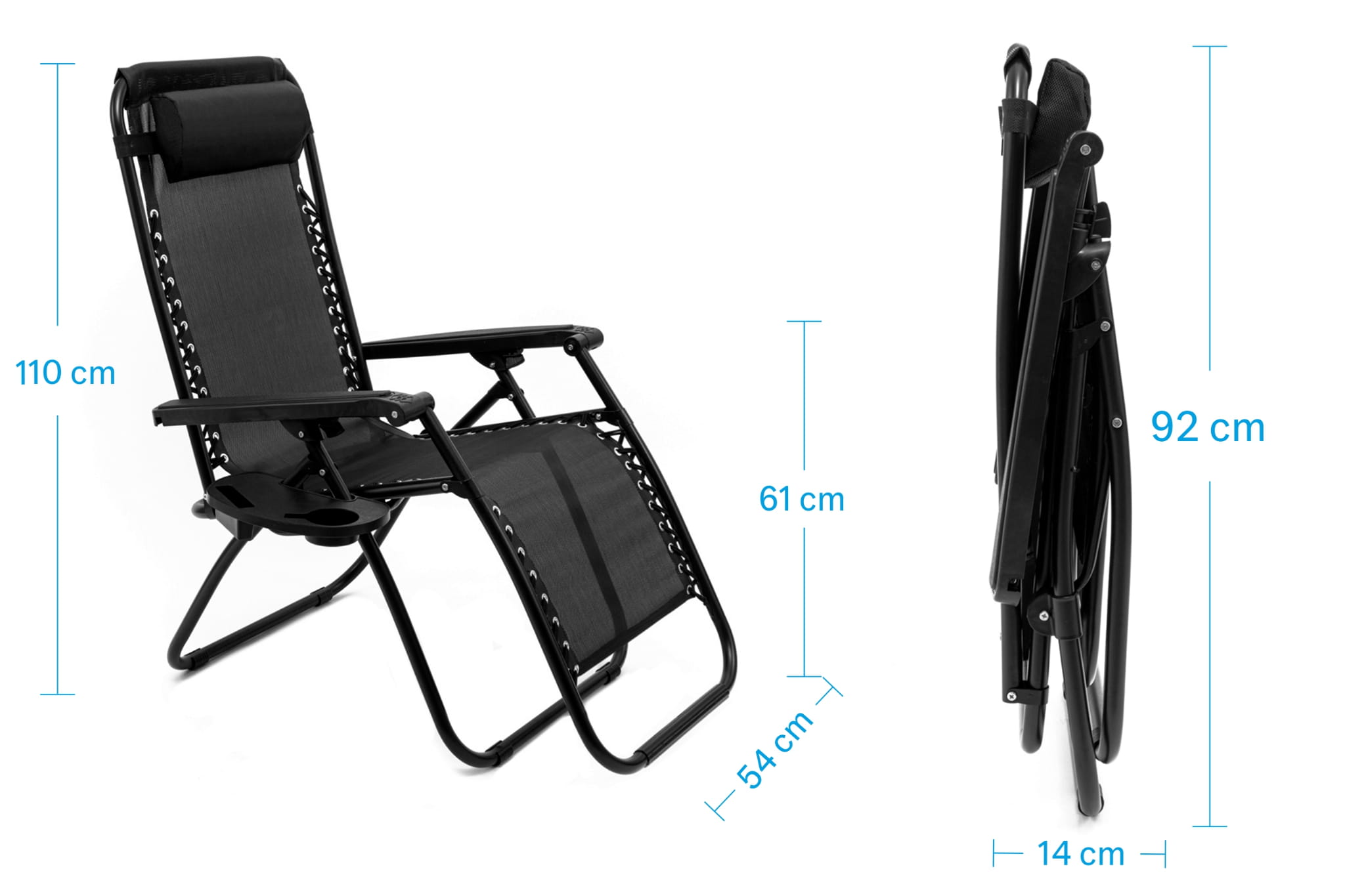 Składany, komfortowy leżak z podnóżkiem, zagłówkiem i stolikiem na napoje w kolorze czarnym.
