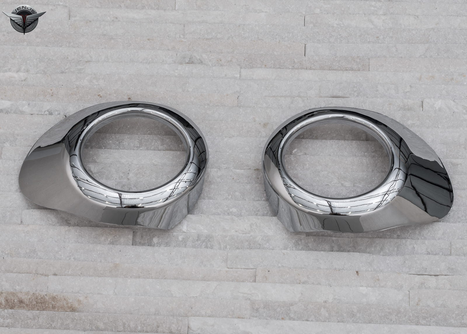 Zestaw zawiera komplet dwóch nakładek lamp. Produkt wykonany z wysokiej jakości chromowanego tworzywa ABS. Montowane są za pomocą taśmy dwustronnie klejącej Scotch 3M, zaaplikowanej na wewnętrznej stronie elementów. Zalecamy montaż profesjonalny.